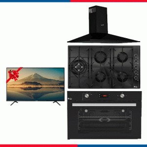 مجموعة من بيورتى تتكون من مسطح غاز 90 سم 5 شعلات HPT905G + وفرن غاز ديجيتال مع شواية KPD917GG GBL + وشفاط هرمي ETO PRO PLUS BL 90CM