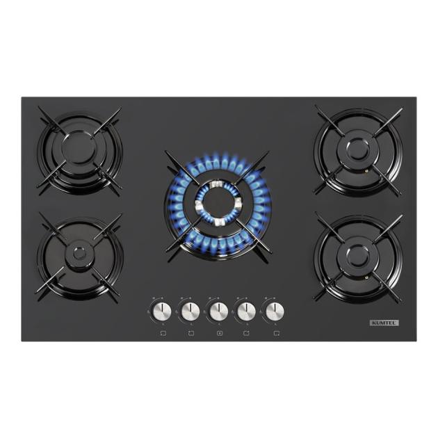 Kumtel 90cm Built-in Gas Hob – 5 Burners, Black Glass, Full Safety Features C9-50 BTF